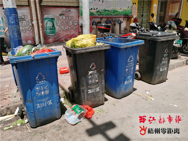 8月4日13時許,在龍湖農(nóng)貿(mào)市場的垃圾桶集中區(qū),地面不少垃圾未清理,影響環(huán)境衛(wèi)生。(黃燁玲 攝)