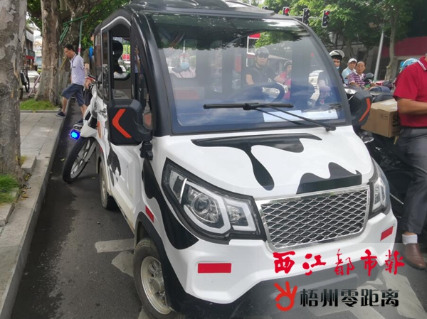 梧州零距離網-西江都市報訊(記者 陳雨燕)8月7日上午,一輛電動四輪車行駛在萬秀區新興一路潘塘公園對開的機動車道,被在該路段執勤的萬秀交警大隊民警截停。民警檢查發現,這輛電動四輪車的安全性能達不到上路行駛的標準,車內沒有安全帶,還載著孩子。民警依法查扣了這輛電動四輪車。