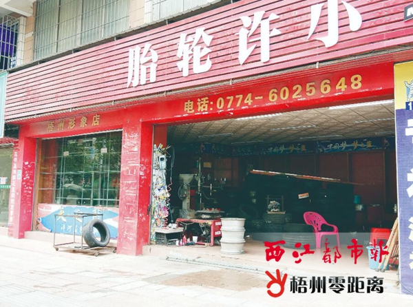8月12日10時許,新興珠寶路一家汽修店門前的人行道上擺放有輪胎和推車。