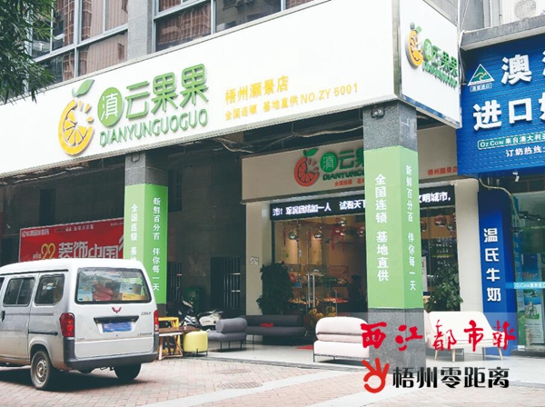 在迎賓路,一些果蔬店存在占道經營的現象。尤其是在皇朝福邸小區對開的人行道上,好幾家果蔬店都在店門前擺放商品,有的店家就在人行道上清洗挑揀蔬果。10時30分許,記者在該路段還看到,一家水果店門前雜亂無章地擺放了不少沙發,影響了通行。在一家奶茶店門前的道路上,不僅停放有兩輪車,還擺放有幾張椅子。