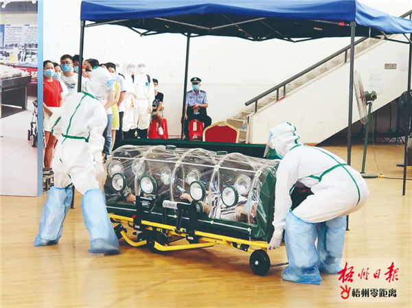 梧州零距離網-梧州日報訊(記者 陳素雅)8月13日,梧州市新冠肺炎疫情應急處置演練在梧州學院體育館舉行。這一次的應急處置演練,是模擬我市出現新冠肺炎疫情后,各相關部門聯動協作應急處置的全流程。 據了解,近期國內部分地區相繼出現新的新冠肺炎患者,使得秋冬疫情防控形勢嚴峻。為有效控制可能出現的新冠肺炎輸入性疫情的傳播風險,梧州市新冠肺炎疫情防控工作領導小組指揮部根據《廣西新冠肺炎疫情應急處置工作預案》,模擬我市出現進口冷鏈食品污染所致的新冠肺炎疫情,以及中高風險地區來梧返梧人員出現核酸檢測陽性兩種情景,組織開展應急處置演練。