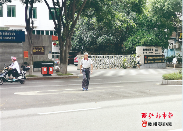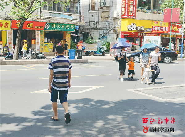 8月16日10時許,一名男子在新興二路梧州日報社對出路段,從機動車道掉頭口橫穿馬路。 陳雨燕 攝 此外,還有市民選擇跨過機動車道的綠化帶后亂穿馬路。上午10時許,記者在新興二路大塘市場對出路段看到,多名市民從人行道直接走出機動車道,跨過道路中央的綠化帶,橫穿馬路。他們當中,有步履蹣跚的老人,有擔著青菜的攤販,更有抱著小孩的年輕人。開車經過的司機發現有市民橫穿馬路,基本會減速讓行,但多個穿梭在車流中的身影,仍然令人捏一把汗。11時許,記者在蝶山一路、新興珠寶路、春湖路等路段走訪,均發現市民橫穿馬路的情況。