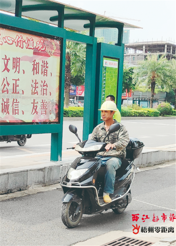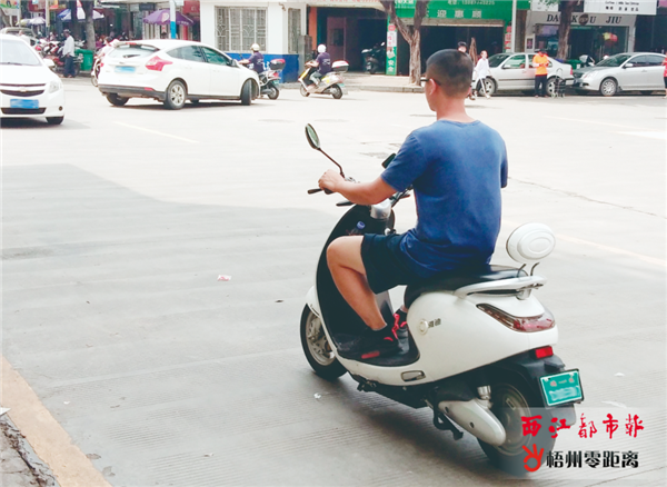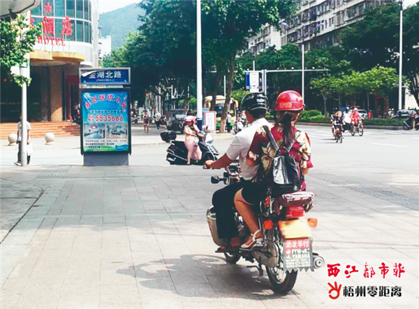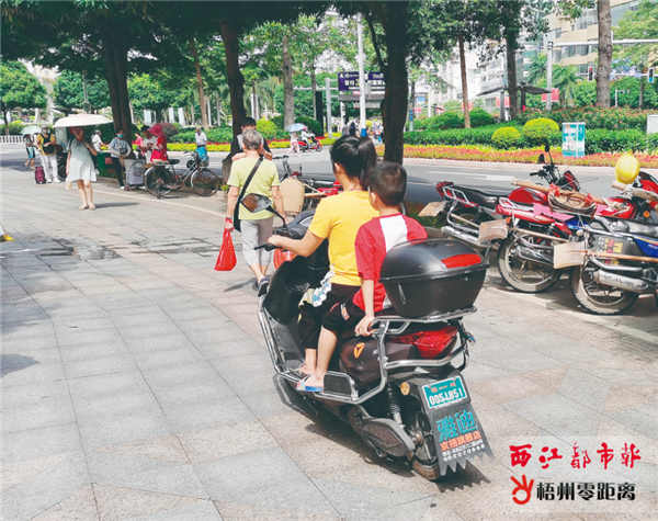 8月17日10時(shí)22分,在紅嶺路海駿達(dá)花園對(duì)出路段,有市民開兩輪車載著孩子逆行。 黃丹婷 攝 與此同時(shí),記者在萬(wàn)秀區(qū)各主要街道發(fā)現(xiàn),總體而言,兩輪車逆行情況較少,但在大學(xué)路路段兩輪車逆行情況依然存在。當(dāng)天,梧州市公安局交警支隊(duì)萬(wàn)秀大隊(duì)在大學(xué)路整治兩輪車逆行行為,在半小時(shí)內(nèi)有6輛兩輪車因在該路段內(nèi)逆行而被查處。這部分車主表示,逆行原因?yàn)椤皼]注意看交通標(biāo)志”“貪方便”等。