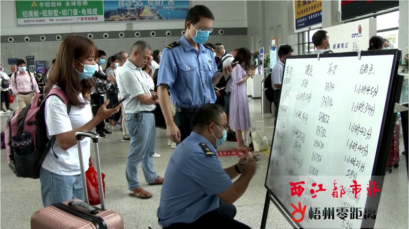 19日,旅客在梧州南站查看列車晚點停運及退改簽信息。(莫超信 攝) |