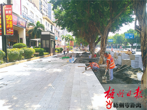 近段時間以來,我市實施西堤路提升改造工程,施工單位分期分段開展改造施工。目前,北側人行道已封閉并逐段破拆,工人加快安裝地下管線、鋪設人行道路面。梧州日報記者 李鴻榮 攝