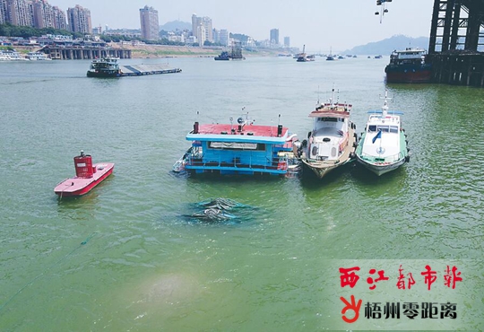 9月3日12時左右,涉事貨船大部分船體已經(jīng)沒于江水中。記者 何鎏 攝