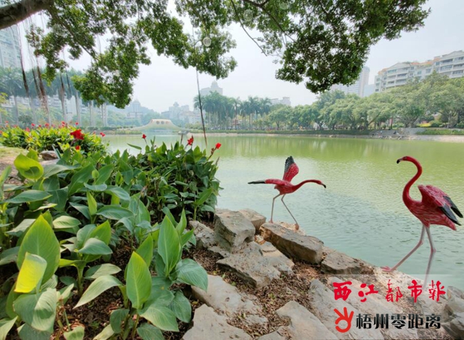 近日,潘塘公園湖心島上出現了兩只在此“乘涼”的“火烈鳥”。 近段時間,潘塘公園新增一批玻璃鋼仿真動物雕塑,如火烈鳥、長頸鹿、朱鹮、鴛鴦、白鷺等,分別布置在湖心島、新六角亭旁等處,進一步提升景觀效果。記者 陳凡 攝