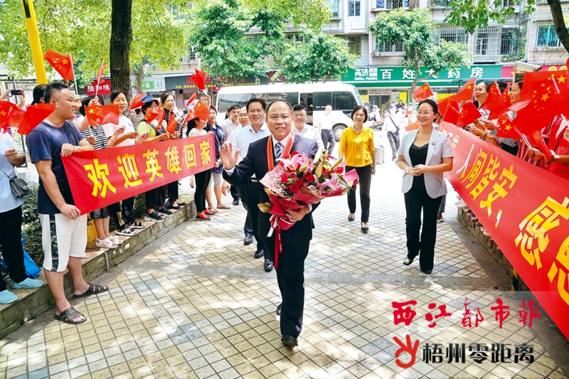 9月9日,市委書記全桂壽到梧州南站,迎接參加全國抗擊新冠肺炎疫情表彰大會并獲授“全國抗擊新冠肺炎疫情先進個人”榮譽稱號的市工人醫院副院長高興華回梧。記者 陳凡 攝 全國抗擊新冠肺炎疫情表彰大會8日上午在北京人民大會堂隆重舉行,高興華作為梧州市新冠肺炎醫療救治首席專家,被授予“全國抗擊新冠肺炎疫情先進個人”榮譽稱號。 9日中午12時44分,高興華乘坐的列車到站,全桂壽代表市委、市政府,第一時間向這位抗疫英雄獻上鮮花,并表示衷心祝賀和崇高敬意。聞訊而來的醫護人員、市民在車站出口揮舞國旗迎接。隨后,騎警開道、專車護送,以高規格的禮儀迎接英雄回家。