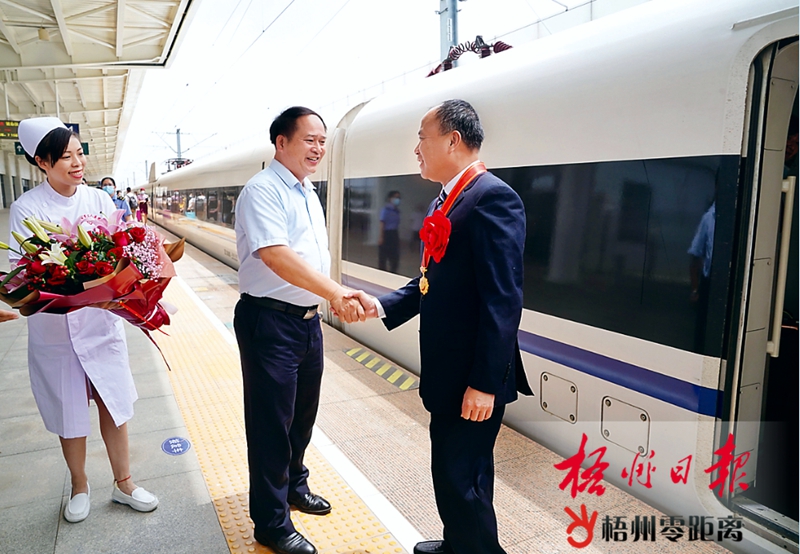梧州零距離網-梧州日報訊(記者 陳素雅)9月9日中午,我市獲抗疫國家級表彰并受邀到北京出席全國抗擊新冠肺炎疫情表彰大會的市工人醫院副院長高興華回到梧州。市委書記全桂壽率我市部分醫療衛生單位代表在梧州南站迎接他載譽歸來。