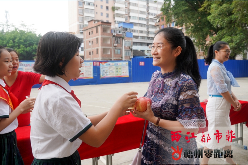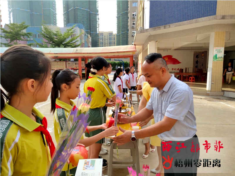 9月10日,長洲區長紅小學的學生把鮮花和賀卡送給自己的老師,向老師們表達節日的祝福與真誠的謝意。 當天是第三十六個教師節,為弘揚尊師重道的優良傳統,梧州日報社聯合廣西忠海置業發展有限公司,在長洲區的長紅小學、龍新小學、新興小學同時開展“感念師恩,立德樹人”主題活動。秦炯培 攝