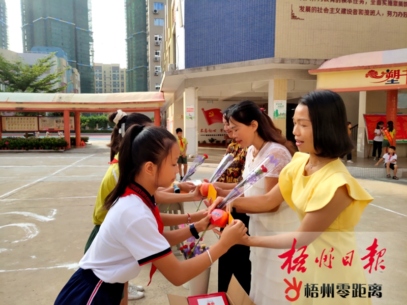 9月10日,長洲區長紅小學的學生把鮮花和賀卡送給自己的老師,向老師們表達節日的祝福與真誠的謝意。 昨天是第36個教師節,為弘揚尊師重道的優良傳統,梧州日報社聯合廣西忠海置業發展有限公司,在長洲區的長紅小學、龍新小學、新興小學同時開展“感念師恩,立德樹人”主題活動。秦炯培 攝 |