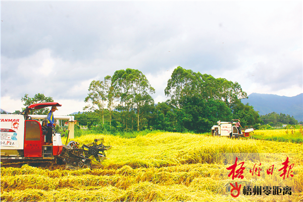 9月15日,在蒙山縣文圩鎮屯治村,宇遠農業發展有限公司用聯合收割機搶收成熟的晚稻。
