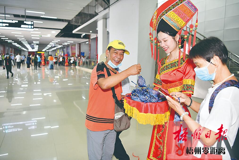 9月22日,梧州非遺文化動態展演中,模特身著民族服飾走秀,同時展示梧州特色名優產品。 記者 陳凡攝 第一次來梧州的王歡表示,他感受到梧州人文底蘊深厚,和惠州一樣具有豐富的紅色旅游資源,以后可以研究發掘兩地紅色旅游資源的合作。“兩廣山水相似,但文化不可復制,經歷今年的疫情,很多游客對祖國的歷史文化認可度更高,從而激發新的旅游活力,我們確實應當抓住這難得的機遇共謀發展?!蓖鯕g說。 作為系列活動之一的梧州名優產品文創設計制作展示活動,主辦方將文創產品作為紀念禮品贈予兩省區35市的與會嘉賓,這份用六堡茶、龜苓膏、冰泉豆漿、人工寶石飾品、田七牙膏等梧州“五寶”設計制作的文創作品,讓來自百色市靖西古龍山旅游管理股份有限公司的嘉賓張超愛不釋手。“六堡茶在百色知名度很高,把騎樓城建筑融入包裝設計也很有特色,通過文創作品這個窗口可以讓游客快速對梧州的歷史和風土人情有一個大致的印象?!?/p>