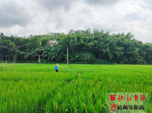 梧州零距離網(wǎng)-梧州日?qǐng)?bào)訊(記者 蒙敏瑩 通訊員 黃錦霞)9月23日,在蒼梧縣旺甫鎮(zhèn)車頭村的稻田里,綠油油的稻苗已經(jīng)冒出淺黃色的幼穗,長(zhǎng)勢(shì)良好。幾名農(nóng)民穿梭其間,正忙著開展田間護(hù)理工作。