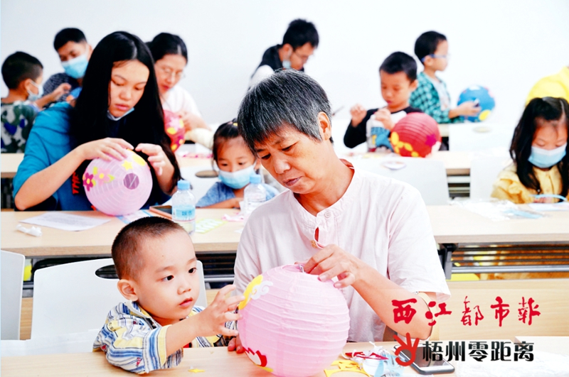 9月26日,在梧州市旺城黨群服務中心《每周益課》活動現場,家長陪同孩子制作中秋節特色燈籠,了解中秋節的習俗,傳承中華民族傳統文化。