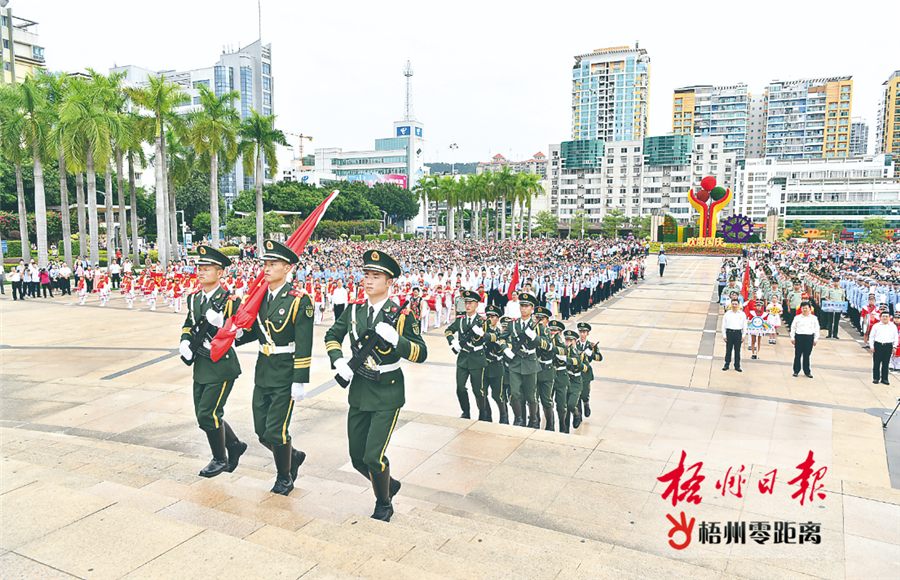 市黨政軍領導全桂壽、黃振饒、尤易武、吳浩嶺、鐘碧珍、黃恩、徐文偉、黎永益、徐遠洲、蘇建中、莫永東、藍明月、李彤華,梧州學院黨委書記韋仕珍,與各界代表約1000人一同參加升國旗儀式。
