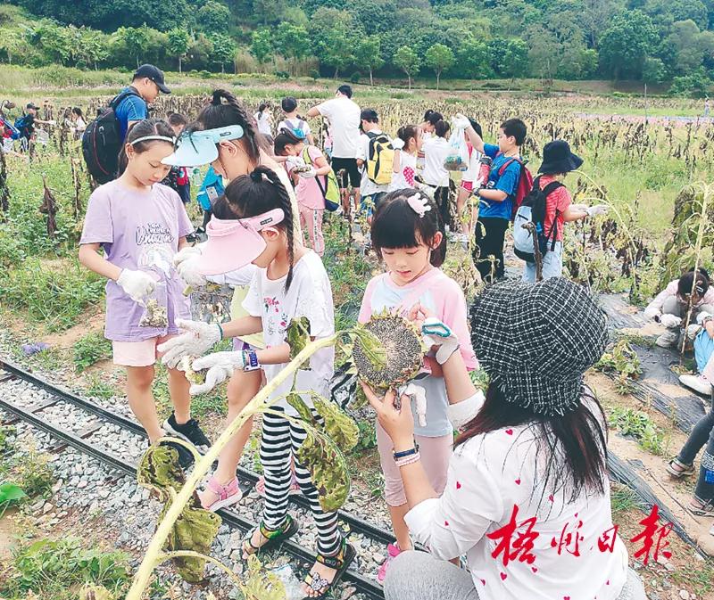10月3日,在研學(xué)老師的指導(dǎo)下,梧州日?qǐng)?bào)社的小記者在向日葵花海中,邊采摘葵花籽,邊學(xué)習(xí)這種花卉的有關(guān)知識(shí)。 當(dāng)天,在梧州日?qǐng)?bào)社組織下,57名小記者走進(jìn)歡樂花谷景區(qū),參加“小記者玩轉(zhuǎn)歡樂花谷”研學(xué)活動(dòng)?;顒?dòng)中,小記者們通過與小動(dòng)物互動(dòng),體驗(yàn)葵花籽采摘和炒制等方式學(xué)習(xí)了動(dòng)植物知識(shí),并通過參加“水城勇士”活動(dòng)培養(yǎng)團(tuán)體意識(shí)。 韋僖旻 攝 |