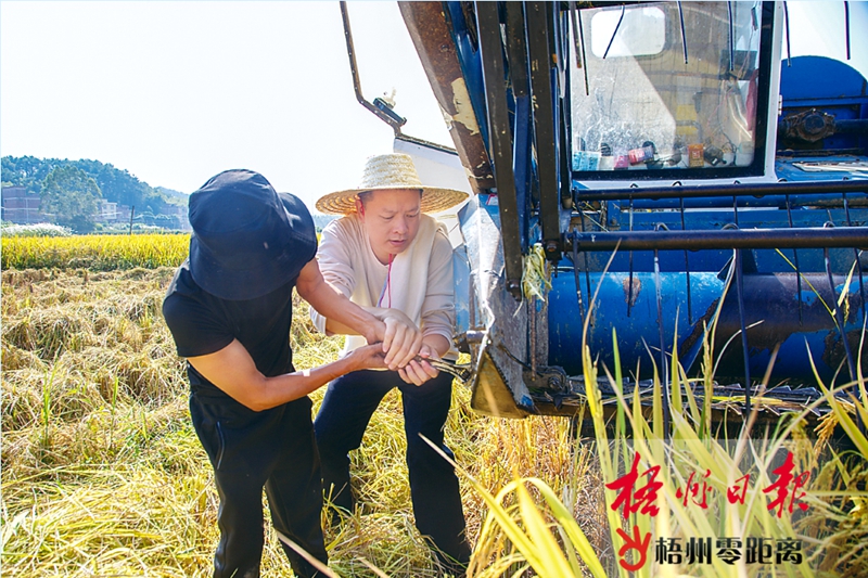 梧州零距離網(wǎng)-梧州日?qǐng)?bào)訊(記者 蒙敏瑩)10月28日,在萬(wàn)秀區(qū)夏郢鎮(zhèn)答涓村,微風(fēng)拂過(guò)金黃色稻田,泛起滾滾稻浪,淡淡的稻香彌漫在空氣中。近段時(shí)間,梧州各地的晚稻陸續(xù)成熟,農(nóng)戶搶抓晴好天氣陸續(xù)開(kāi)鐮收割,晚稻收割工作有序推進(jìn)。