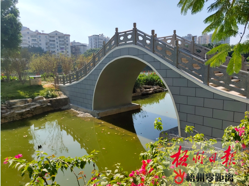 梧州零距離網(wǎng)-梧州日?qǐng)?bào)訊(記者 冼振宇)經(jīng)過升級(jí)改造后的潘塘公園面貌煥然一新,公園綠道、湖心島及路燈等重新打造的景觀讓整個(gè)公園更加美麗,也成為不少市民休閑健身娛樂的好去處。然而,有市民在公園散步時(shí)發(fā)現(xiàn),連接湖心島的一座拱橋橋底,由于有一道小水壩,導(dǎo)致橋底經(jīng)常堆積落葉垃圾,影響了公園的優(yōu)美景觀。 熱心市民陳女士住在潘塘公園旁邊的湖光水岸小區(qū),看著潘塘公園一天天變漂亮,她也感到很高興。然而,近期她在公園里散步時(shí)留意到,原先連接湖心島的石板橋改建為拱橋以后,橋底多了一道低矮的小水壩。在公園改造升級(jí)施工時(shí),這道小水壩作為阻擋湖水之用,可是如今改造升級(jí)完成后,這道小水壩依然存在。由于湖水剛好浸過小水壩,湖面漂流的落葉等垃圾,流到這道小水壩便被截留了,過幾天,拱橋底就會(huì)形成一個(gè)堆積垃圾的衛(wèi)生死角,十分影響公園的環(huán)境。10月26日,陳女士向本報(bào)反映這個(gè)情況。 隨后,記者根據(jù)陳女士反映的情況到現(xiàn)場(chǎng)了解。在潘塘公園湖心島附近,一座嶄新的拱橋取代了以前較為低矮的回形石板橋,在橋底的位置,確實(shí)能夠看到有一些水壩模樣的物體影響了湖水的流動(dòng),一些跟隨湖水流動(dòng)的方向而漂流的浮萍、落葉在橋底的位置便停留,遠(yuǎn)看就像沒有活水流動(dòng)的臭水溝。