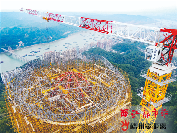 近段時間,有關施工單位連續對西江明珠塔塔頂“寶石”造型進行施工,目前已經搭建起部分“寶石”框架。