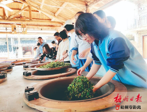 11月8日,梧州高中學生在蒼梧縣茶業(yè)有限公司體驗炒制六堡茶。秦炯培 攝