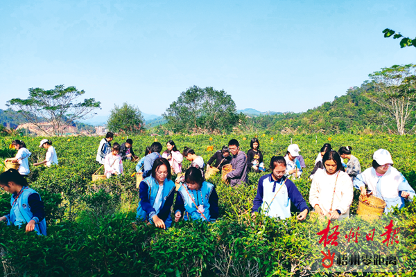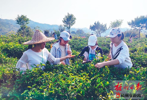 梧州高中學生在工作人員的指導下采摘六堡茶。 韋僖旻 攝