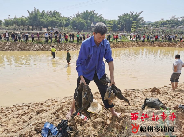 當(dāng)天上午,精彩的舞獅表演拉開了活動序幕,活動現(xiàn)場分為主會場、趣味活動區(qū)、農(nóng)特優(yōu)產(chǎn)品美食展銷區(qū)等三個主要區(qū)域。其中,農(nóng)特優(yōu)產(chǎn)品展銷區(qū)展示了30多種當(dāng)?shù)氐霓r(nóng)產(chǎn)品,游客們一邊向農(nóng)戶了解產(chǎn)品情況一邊選擇購買。 除了農(nóng)產(chǎn)品展示,活動主辦方還設(shè)置了搖擺橋、猜謎等活動項目,其中最讓游客有參與感的就是摸魚抓鴨游戲。主辦方當(dāng)天投放了2000多斤鯇魚和100多只鴨子在池塘里,讓游客自由擒抓,并免費帶走。結(jié)果,游客們紛紛挽起褲腳走進池塘擒抓自己看中的目標(biāo),場面非常熱鬧。 |