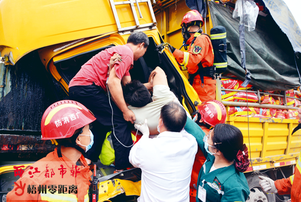 梧州零距離網-西江都市報訊 11月18日7時許,包茂高速梧州往岑溪方向2834KM處發生一起貨車追尾掛車的交通事故,造成1人受傷,市消防救援支隊岑溪市天橋消防救援站緊急出警趕赴現場處置。