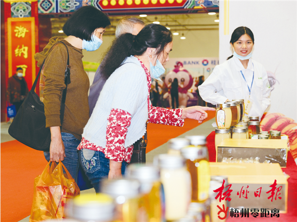 市民正在選購心儀的特產(chǎn)。記者 鐘慧 攝 除了外地市民對梧州美食念念不忘,梧州市民對自家的美食也十分捧場。在梧州毅德國際博覽城二樓的全區(qū)扶貧食品特色產(chǎn)品展館里,不到1個小時,市民張竹梅和丈夫雙手已經(jīng)提滿大包小包的美食,如腐竹、蜜糖、花生酥等。張竹梅笑著說:“展會展示了廣西各地的特色美食,讓我們品嘗美食的同時體驗了一次瘋狂的‘買買買’購物體驗。”