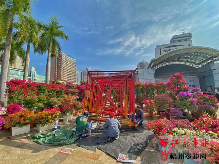 12月1日,工作人員在市政廣場制作寶巾花展擺設,本次寶巾花展布展工作接近尾聲。作為本屆寶石節系列活動之一的第二十一屆梧州市寶巾花展,將于12月5日至8日在市政廣場舉行。