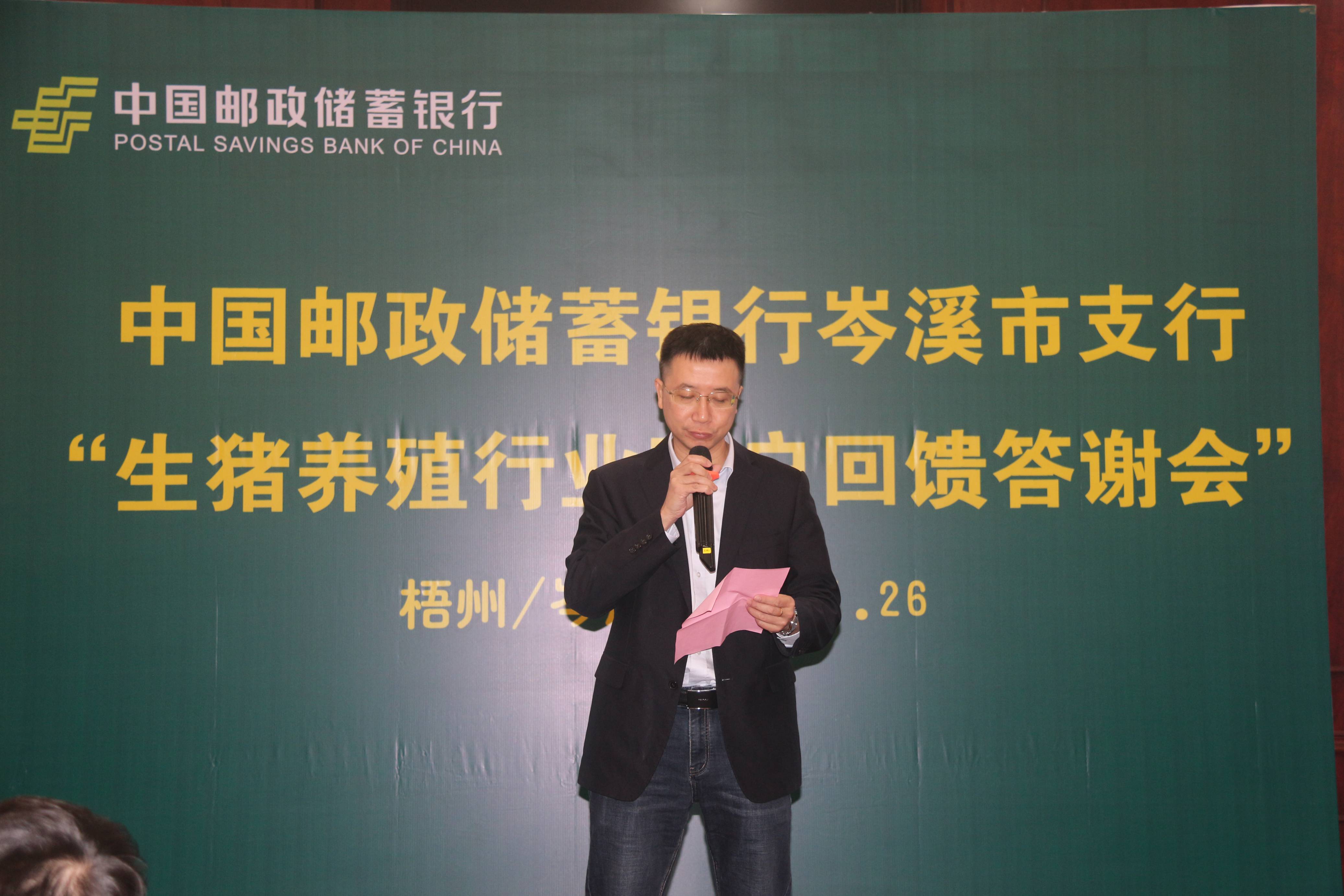 為進一步加大對生豬生產的信貸支持力度,郵儲銀行梧州市分行聯合廣西農業信貸融資擔保有限公司,于11月26日攜手生豬養殖戶共同舉辦“生豬養殖行業客戶回饋答謝會”?;顒哟罱算y行和客戶之間深入溝通的平臺,使客戶更確切了解當地生豬養殖行業形勢和養殖戶在金融服務方面的需求。