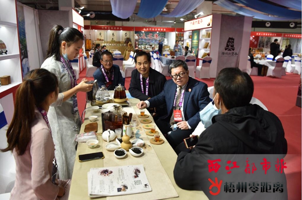 在第一書記扶貧產品特裝展區,來自我市47個貧困村第一書記現場帶貨的地方特產擺滿三層貨架,其中相當一部分是今年首次參展的村集體經濟新創品牌和新產品,如長洲區倒水鎮富萬村的頭層腐竹,是由村里的貧困戶經過八個農家工序步驟手工制作而成;龍圩區廣平鎮平山村利用當地旱地帶動100戶貧困戶種植花生,并采用獨特的木榨工藝生產清香花生油首次參展…… 在名特優產品龍頭企業獨立特裝展區,廣西梧州甜蜜家蜂業有限公司和梧州神冠蛋白腸衣有限公司的負責人帶著銷售團隊站在貨架前,詳細為嘉賓們介紹產品特色和企業文化,并熱情招呼嘉賓們品嘗試食。在茶產業產品綜合展區,38家梧州六堡茶企業展銷的六堡茶從普通“口糧茶”到高檔禮品茶,從自留飲用到收藏升值,應有盡有。