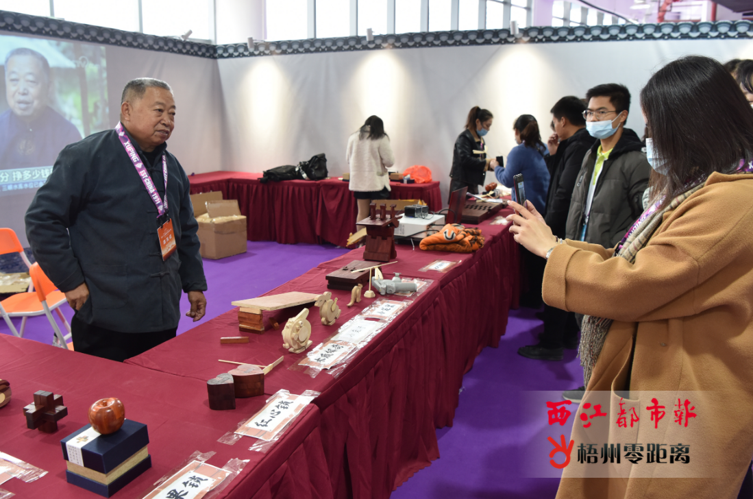 在第三屆梧州工藝美術作品展會場,刀畫、玉雕、磚雕等多名藝術家正在進行技藝表演。