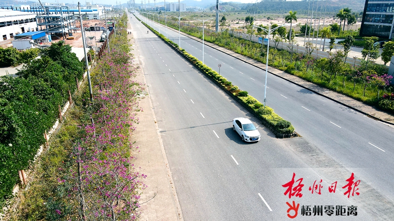 12月9日,車輛行駛在梧州循環經濟產業園區大道上。近段時間,梧州循環經濟產業園區綠化彩化成效顯現,道路邊的紫荊花紛紛盛開,配合著路中間規整的綠化帶,將園區道路裝點得分外美麗。記者 楊揚 攝