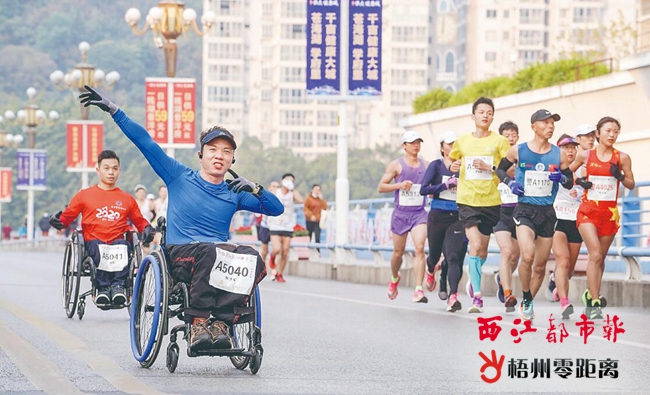坐輪椅參賽的選手展現出良好的體育競技精神。 記者 陳凡 攝 當天,近萬名助威群眾及社會表演團隊,點燃了選手比賽的激情。來自萬秀區、長洲區、粵桂合作特別試驗區的啦啦隊,在賽事組委會的安排下,分布在賽道沿途的數十個氛圍點為選手們加油助威,讓選手們感受到梧州這座城市的熱情。 |