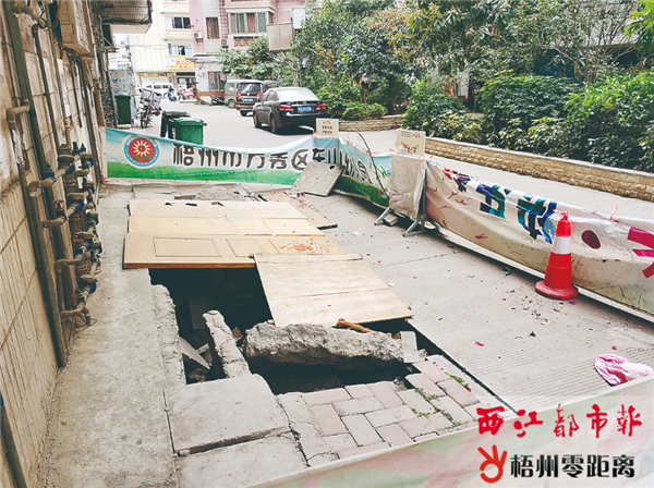 梧州零距離網-西江都市報訊(記者 謝韻)“東山幼兒園旁發生地陷已經快半年了,還沒有人來維修,太危險了。”2020年12月26日,有網友在梧州零距離網絡問政發帖,希望有關部門重視該問題并及時進行維修。對此,萬秀區東山社區方面表示,已將地陷的相關問題進行上報,正在等待資金落實便可進行維修。 2020年12月29日,記者來到東山幼兒園旁看到,大門旁不足10米的人行道上,有一個寬約2米、長約3米的大窟窿。窟窿里磚頭、爛石板散落,還散發出一股異味。窟窿周邊已經用廣告布圍起來,并放置了警示牌,提醒居民請勿隨意靠近。