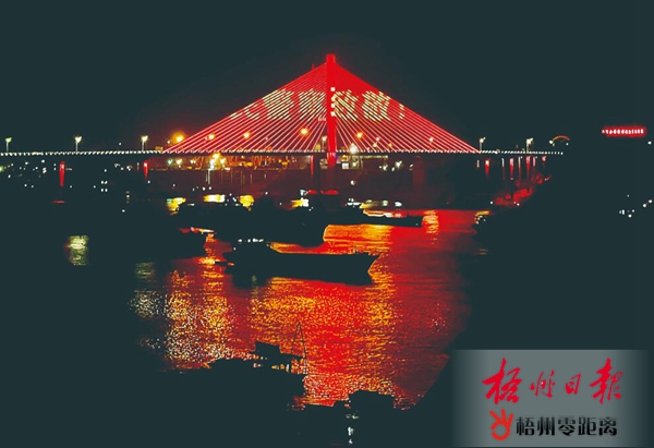1月10日,云龍大橋用燈光效果循環顯示致敬人民警察字幕。 當天是首個“中國人民警察節”,為營造關心關愛人民警察的良好氛圍,市文明辦、市公安局聯合開展“為人民警察亮燈”公益活動。 梧州日報記者 楊揚 攝