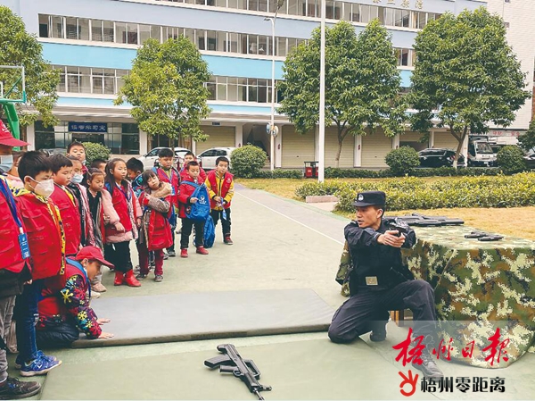1月10日,梧州日?qǐng)?bào)社小記者研學(xué)團(tuán)的60多名小記者走進(jìn)梧州出入境邊防檢查站,零距離參觀體驗(yàn)警營(yíng)生活。圖為民警向小記者展示槍支器械。