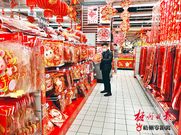 隨著春節(jié)漸近,各種年貨的銷售也隨之升溫。1月19日,記者在大潤發(fā)超市內(nèi)看到,應(yīng)節(jié)的春聯(lián)、年畫、利是封等年貨商品已經(jīng)大量上架,吸引了市民駐足選購。 吳小華 攝