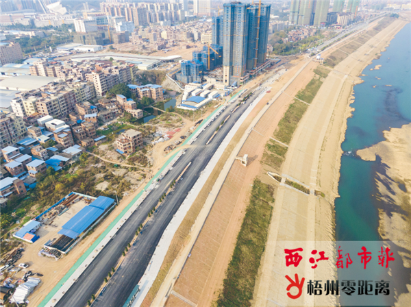 近段時間,濱江大道(西堤路延長線—西江三橋)工程項目正在集中力量趕工期鋪設沿江路段的瀝青路面,同時修建西江三橋北橋頭的引橋路段,力爭項目及早貫通。 西江都市報 記者 陳凡 攝