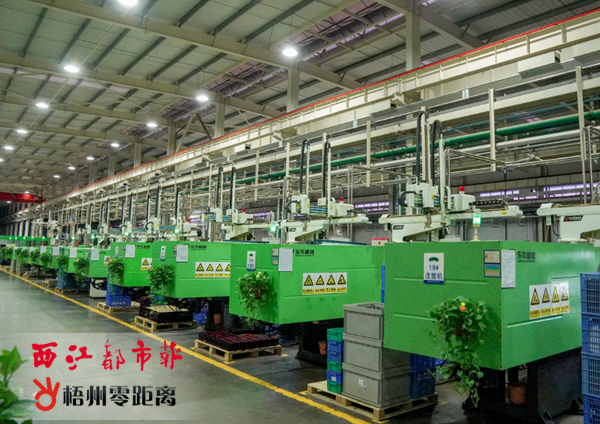2月18日,位于梧州循環經濟產業園區的駱駝集團華南蓄電池有限公司生產車間內的每臺注塑機均懸掛綠植進行裝飾。