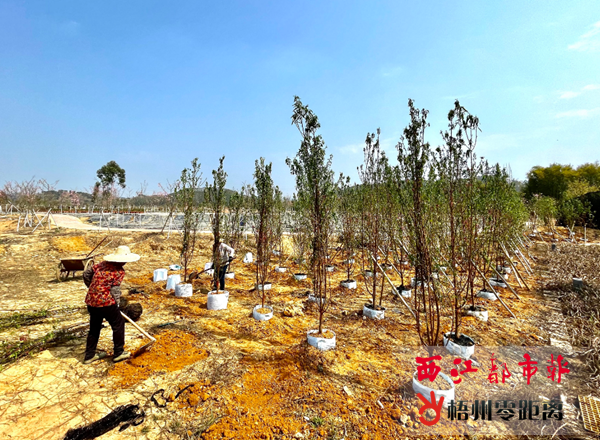 2月24日,在萬秀區夏郢鎮鎮安村思良江綜合治理核心示范區,工人在栽種桃花。