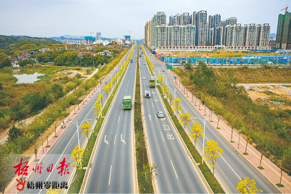 2月24日,龍騰大道中間隔離帶和道路兩旁的黃花風鈴木的花迎春綻放,宛若黃金灑滿大道,成為一道美麗的風景線。 何華文 攝