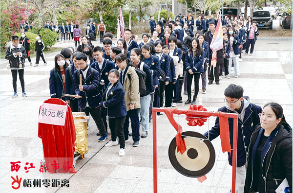 2月28日,梧州高級中學高三年級學生在百日誓師活動中擊鼓鳴鑼。