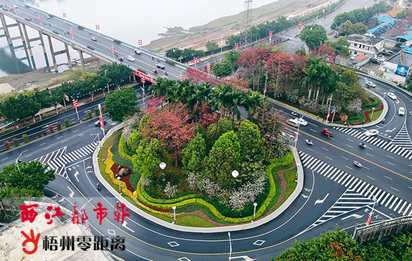 3月6日,西江大橋汊河橋頭轉(zhuǎn)盤內(nèi)精心排列搭配的花卉紛紛盛放,色彩繽紛,與機動車道組成一幅別致的城市畫像。近年來,我市綠化提質(zhì)行動成效顯著,在城區(qū)逐漸形成“一路一景”“一街一品”的綠化美化格局。梧州日報記者 楊揚 攝