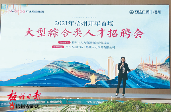 招聘會(huì)現(xiàn)場(chǎng),業(yè)內(nèi)人士介紹梧州萬(wàn)達(dá)廣場(chǎng)的項(xiàng)目定位及未來規(guī)劃等情況。伍懿 攝 此次活動(dòng)是梧州市2021年春節(jié)后的首場(chǎng)大型人才招聘活動(dòng),共吸引30個(gè)企業(yè)參加,提供3000多個(gè)就業(yè)崗位,預(yù)計(jì)將為近萬(wàn)人提供優(yōu)質(zhì)的就業(yè)機(jī)會(huì)。