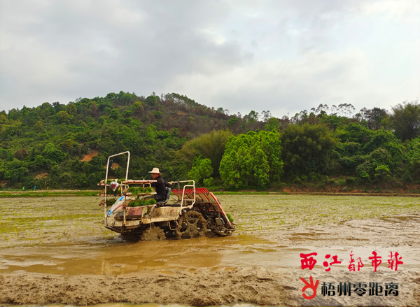 梧州零距離網-梧州日報訊(記者 蒙敏瑩 通訊員 李麗妮 吳榮秋)3月29日,在龍圩區大坡鎮新龍村的稻田里,插秧機來回穿梭,一板板綠油油的秧苗被均勻地插種下去,快速又整齊。負責該片稻田開發的梧州市興民富硒農業科技有限公司負責人李清華說:“機械化插秧不僅效率高,成本也比人工插秧低。”