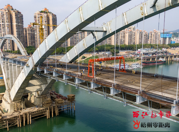 4月6日,施工人員在靠近潯江北岸一側的西江四橋橋面施工。