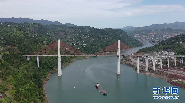 4月8日,G42滬蓉高速上一橋飛架兩岸,貨輪行駛在江面上。新華網 向進 攝