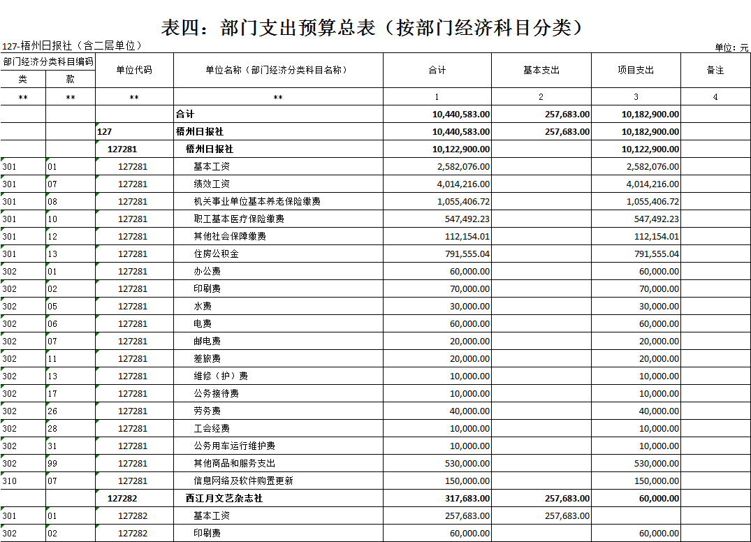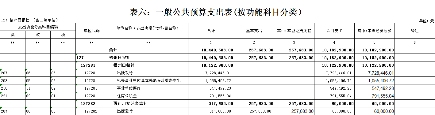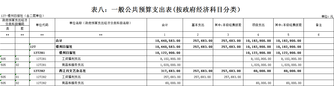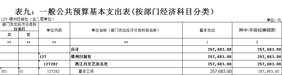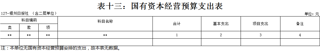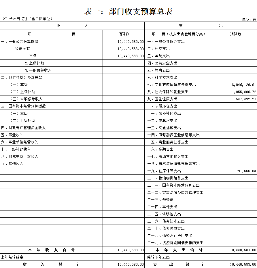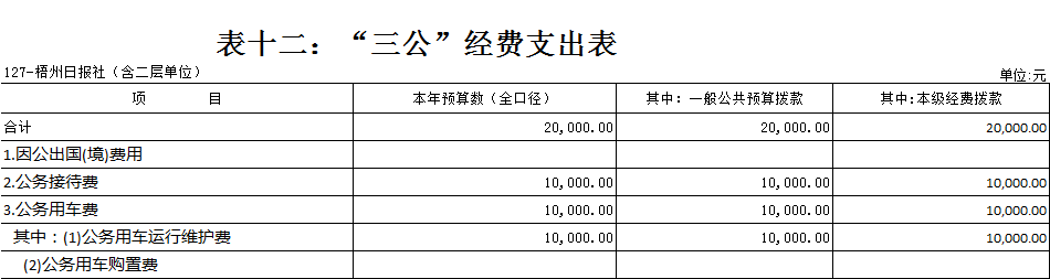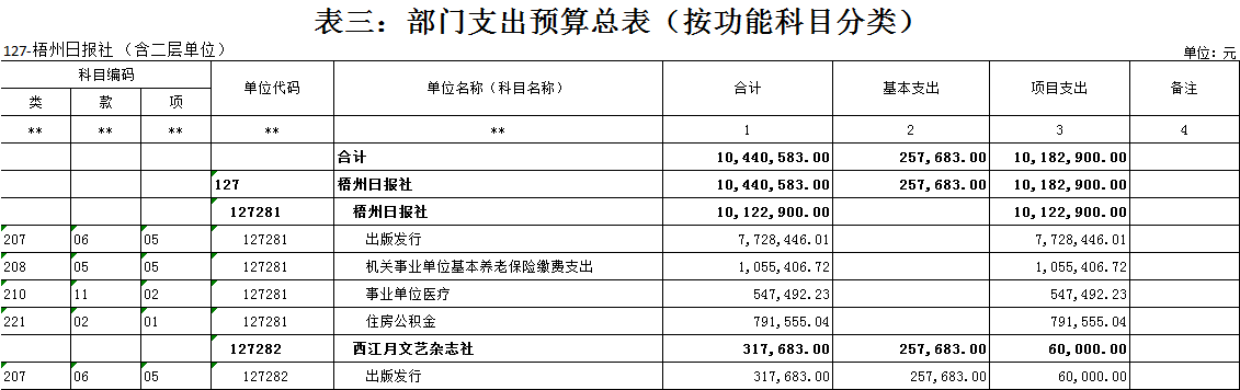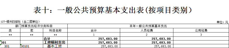 梧州日報社2021年 部門預算及“三公”經費預算情況說明 目錄 第一部分:梧州日報社概況 一、主要職能 二、機構設置情況 三、人員構成情況 第二部分:梧州日報社部門預算及“三公”經費預算情況說明 一、部門收支預算總體預算情況說明 二、部門收入總體預算情況說明 三、部門支出總體預算情況說明 四、財政撥款收支預算情況說明 五、一般公共預算支出情況說明 六、一般公共預算基本支出情況說明 七、一般公共預算安排的“三公”經費情況說明 八、政府性基金預算情況說明 九、2021年部門預算其他事項說明 第三部分:專業名詞解釋 第四部分:梧州日報社2021年部門預算報表(詳見附件) 一、部門收支預算總表 二、部門收入預算總表 三、部門支出預算總表(按功能科目分類) 四、部門支出預算總表(按部門經濟科目分類) 五、財政撥款收支總表 六、一般公共預算支出表(按功能科目分類) 七、一般公共預算支出表(按部門經濟科目分類) 八、一般公共預算支出表(按政府經濟科目分類) 九、一般公共預算基本支出表(按部門經濟科目分類) 十、一般公共預算基本支出表(按項目類別) 十一、政府性基金預算支出表 十二、“三公”經費支出表 十三、國有資本經營預算支出表 第一部分:部門概況 一、主要職能 梧州日報社是梧州市委主管的新聞機構,負責宣傳黨的路線、方針、政策,傳播梧州市主流新聞和其他信息,大力弘揚時代主旋律,圍繞市委市政府的中心工作,服務大局,反映人民群眾的心聲,為梧州政治經濟社會文化發展營造良好的輿論氛圍,促進梧州地方社會經濟文化發展。 負責出版《梧州日報》和《西江都市報》,經營《梧州零距離網站》以及其他書報刊,從事相關印刷、發行、報紙廣告經營業務。分管西江月文藝雜志社。 二、機構設置情況 根據規定,并結合本部門實際,我部門共有12個職能科室,即:黨委辦公室、總編辦公室、財務部、全媒體廣告部、全媒體采訪部、新聞編輯部、專刊編輯部、產業經營部、西江都市報、技術部、人力資源部、梧州零距離網站。有1個下屬單位:西江月文藝雜志社(科級差額補助預算管理事業單位)。 梧州日報社屬于差額預算管理事業單位,西江月文藝雜志社屬于差額預算管理事業單位。 三、人員構成情況 梧州日報社截至2021年1月末,在職職工135人,其中:梧州日報社事業編制人員60人(正處干部2人,副處干部4人,正科級干部5人,副科級干部11人,事業人員38人);西江月文藝雜志社事業編制人員3人;編外聘用72人(未含投遞、臨時廣告人員)。 梧州日報社截至2021年1月末,實有退休職工49人,其中:梧州日報社事業編制退休人員43人,西江月文藝雜志社事業編制退休人員6人。 梧州日報社的經費管理方式屬于差額預算管理事業單位,西江月文藝雜志社屬于差額預算管理事業單位。 第二部分:梧州日報社2021年部門預算及“三公”經費預算情況說明 一、部門收支預算總體預算情況說明 2021年收支總預算10440583元,同比增加56900元,增長0.5%。收入包括:一般公共預算撥款;支出包括:文化旅游體育與傳媒支出、社會保障和就業支出、衛生健康支出、住房保障支出。 2021年收支預算總體增加56900元,主要是以下支出增加:一是印刷發行支出增加;二是人員工資提高,社會保障繳費支出相應增加。使收入預算總體有所增加。 二、部門收入總體預算情況說明 2021年收入總預算10440583元,同比增加56900元,增長0.50%。其中: (一)一般公共預算撥款(含上級補助,下同)10440583元,占收入總預算的100%,同比增加56900元,增長0.50%。 (二)本部門無政府性基金預算收入,同比無變化。 (三)本部門無財政專戶管理資金資金收入,同比無變化。 (四)本部門無事業收入,同比無變化。 (五)本部門無事業單位經營收入,同比無變化。 三、部門支出總體預算情況說明 2021年支出總預算10440583元,其中,基本支出預算257683元,占支出總預算的2.50%,同比減少9463106元,下降97.35 %;項目支出預算10182900元,占支出總預算的97.50%,同比增加9520006元,增長1436.13%。其中: (一)文化旅游體育與傳媒支出類科目8046129.01元,占支出總預算77.07%,同比增加84114.01元,增長1.06%。 (二)社會保障和就業支出類科目1055406.72元,占支出總預算10.10%,同比減少75876.28元,下降6.71%。 (三)衛生健康支出類科目547492.23元,占支出總預算5.24%,同比增加31538.23元,增長6.11%。 (四)住房保障支出類科目791555.04元,占支出總預算7.59%,同比增加17124.04元,增長2.21%。 四、財政撥款收支預算情況說明 2021年財政撥款收支總預算10440583元。收入包括:一般公共預算撥款10440583元;支出包括:文化旅游體育與傳媒支出8046129.01元、社會保障和就業支出1055406.72元、衛生健康支出547492.23元、住房保障支出791555.04元。 五、一般公共預算支出情況說明 2021年一般公共預算撥款支出10440583元,其中:基本支出257683元,項目支出10182900元,具體支出預算如下: (一)一般公共預算支出按支出功能分類科目劃分。 出版發行8046129.01元,其中:基本支出257683元,項目支出7788446.01元。主要用于本部門的基本人員工資福利支出、印刷支出、稿費支出等。 機關事業單位基本養老保險繳費支出1055406.72元,其中:基本支出0元,項目支出1055406.72元。主要用于本部門人員養老繳費支出。 事業單位醫療547492.23元,其中:基本支出0元,項目支出547492.23元。主要用于本部門人員醫療保險繳費支出。 